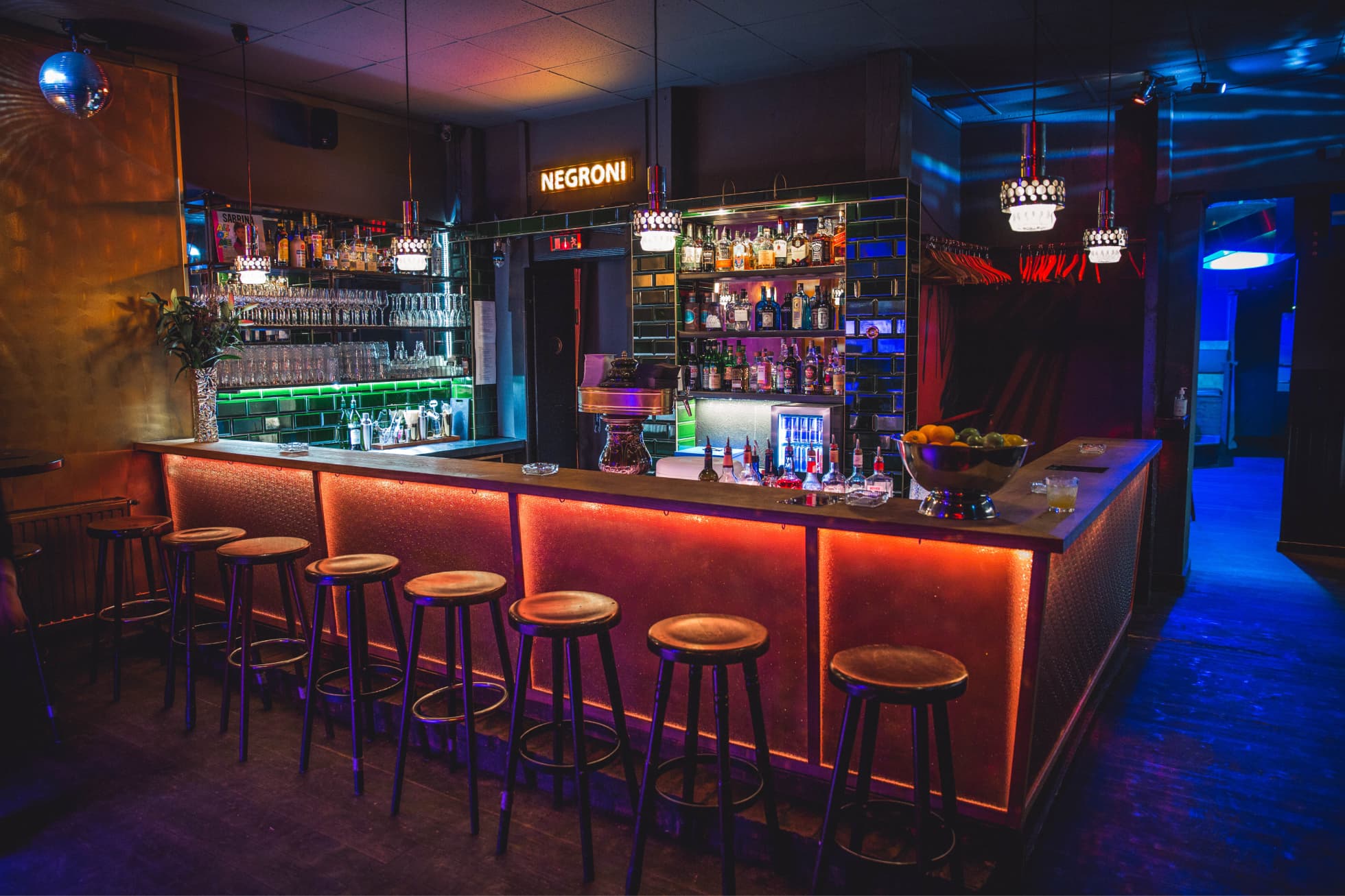 Neben dem oben genannten „beruhigten Gäst*innenraum* im hintersten Bereich der Bar, gibt es im mittleren Raum ein DJ Pult, samt Anlage und Platz zum Dancen. Neben unseren Residents Estelle Van Der Rhone und XX (?), brachten hier bereits das Urgestein der GF114 Herr Von Keil und das Sternchen Bambi Mercury unsere Gäst*innen zum Shaken und Schwitzen. Vorne an der Bar kann man mit ein, zwei Negronis, sowie Pils und (zur Freude der Friends aus dem Süden) auch Hellem vom Fass, gediegener anstoßen und den Abend gemütlicher zubringen. Am Wochenende öfnen wir von 19 Uhr bis mindestens 4 Uhr, unter der Woche schließen wir bereits um 2 Uhr. Im Gegensatz zu früher sind jetzt alle willkommen!
